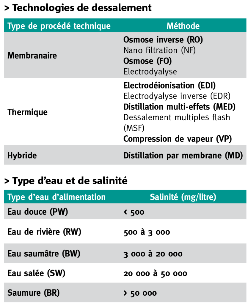 Apeine 30% de l’eau douce totale est potable, soit 0,75% du volume total de l’eau sur Terre, dont presque 70% sous forme de ressources inaccessibles sous forme de glaciers et de calottes glaciaires, presque 30% sous forme d’eau souterraine et 0,27% sous forme d’eau de surface (Gleik et al, 2012). Alors que l’eau salée représente près de 97,5% du volume total d’eau sur Terre et est accessible à presque tous les pays disposant d’un littoral. Ce qui fait aujourd’hui du dessalement de l’eau de mer une option stratégique pour sécuriser l’approvisionnement en eau, surtout dans les pays en situation de stress hydrique. Actuellement, la capacité mondiale de dessalement est de plus de 100 millions de m3 par jour, provenant de plus de 16 000 usines réparties dans 175 pays. Les pays du Moyen Orient et de l’Afrique du Nord (MENA) détiennent presque la moitié de cette capacité mondiale. Les technologies de dessalement les plus utilisées sont l’osmose inverse (RO), le flash multi-étapes (MSF), la distillation multi-effets (MED), l’électrodyalyse (ED) et les technologies hybrides, avec respectivement une part de 63%, 23%, 8%, 3% et 3%.